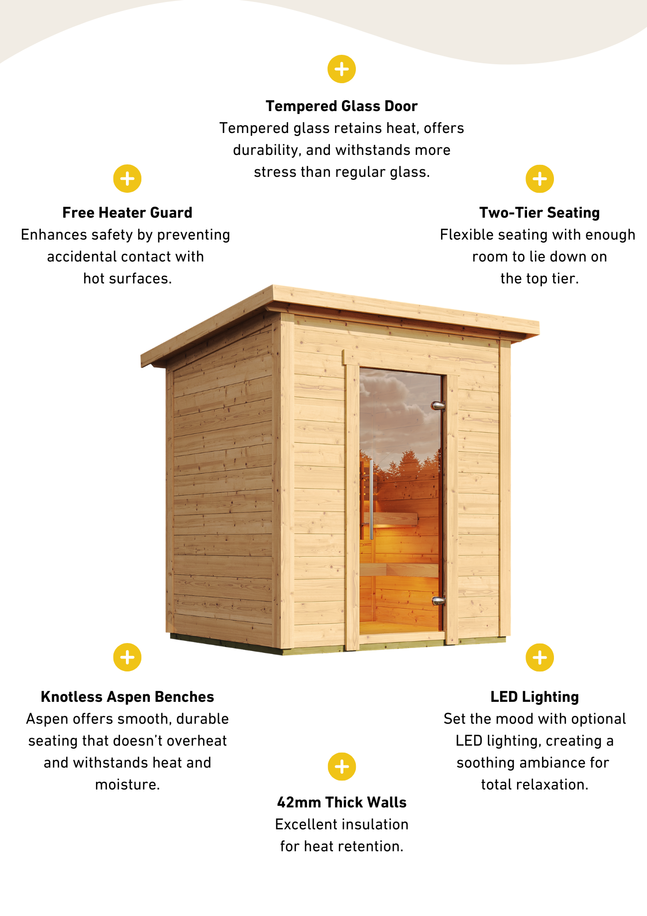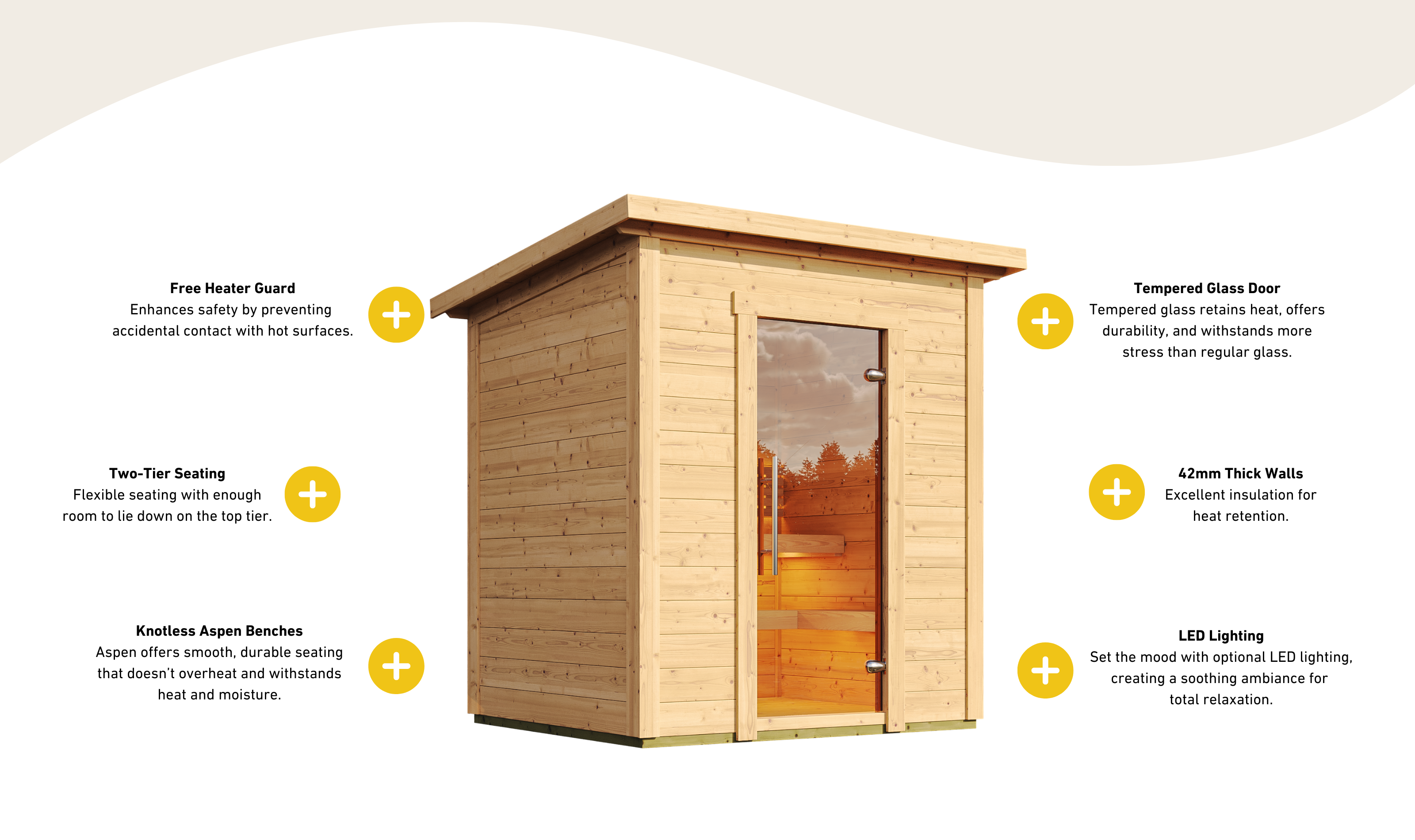 - Sauna Benches: Dual level. Made from premium knotless Aspen