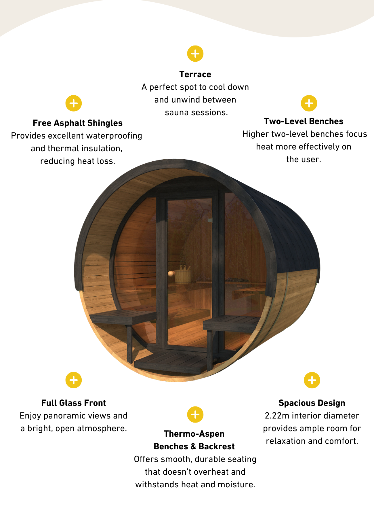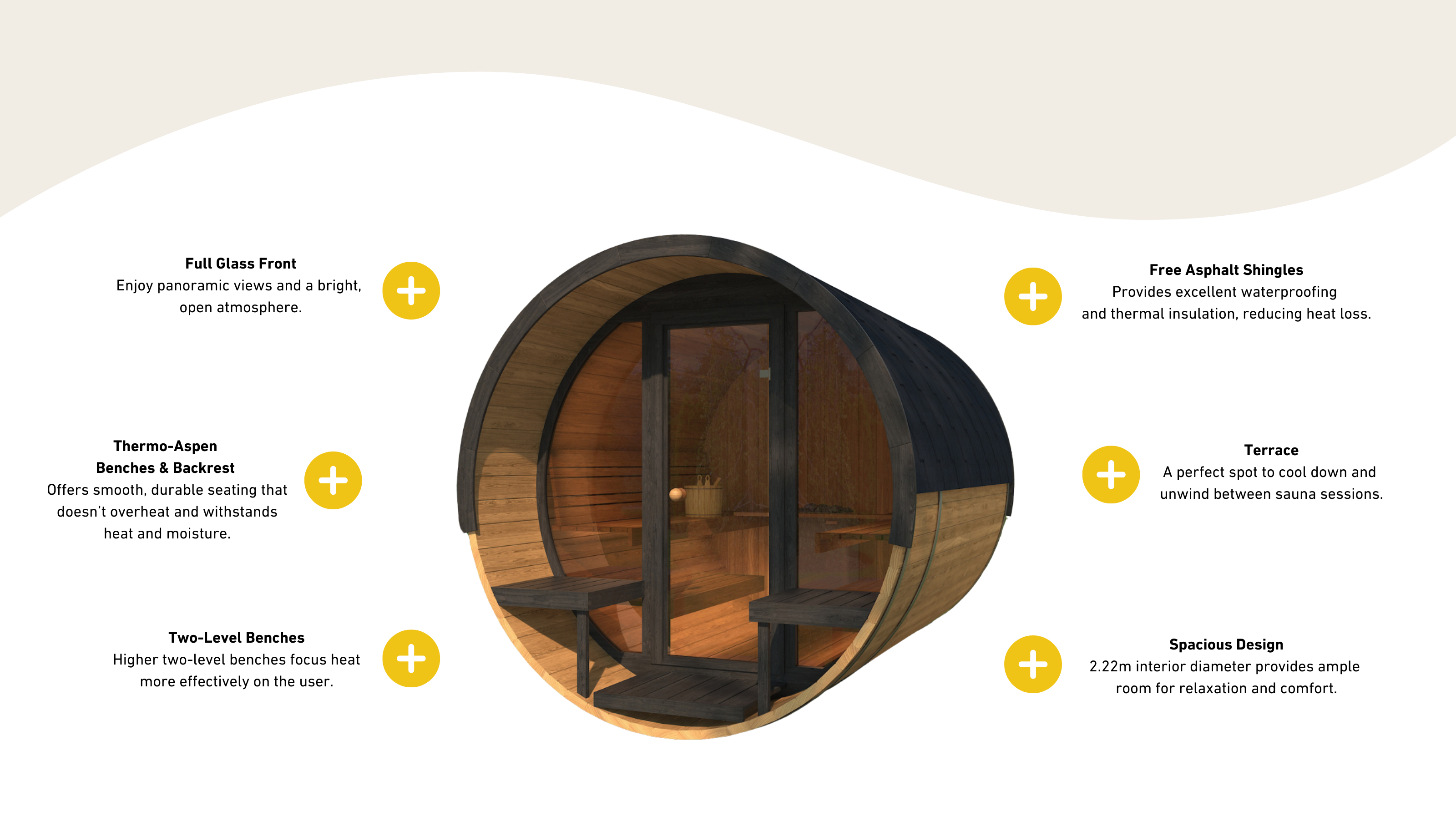 Introducing the Opulent Terrace, a spacious barrel sauna designed for ultimate relaxation. Comfortably fitting up to 6 people, this traditional sauna offers ample space to unwind with loved ones.